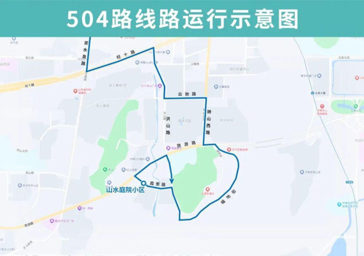 504路恢复后开往葛家庄公交车场方向沿旅游路向西至转山西路向北恢复原线,恢复原转山西路旅游路(路东)、云驰路转山西路(路北)、龙景苑(路北)站点,撤销临时增设的下井庄园(路东)站点;开往山水庭院小区方向线路不变。