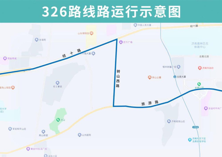 326路恢复后开往燕山立交桥北方向沿旅游路向西至转山西路向北恢复原线,恢复原转山西路旅游路(路东)、转山西路北口(路东)站点,撤销临时增设的下井庄园(路东)站点;开往西营方向线路不变。